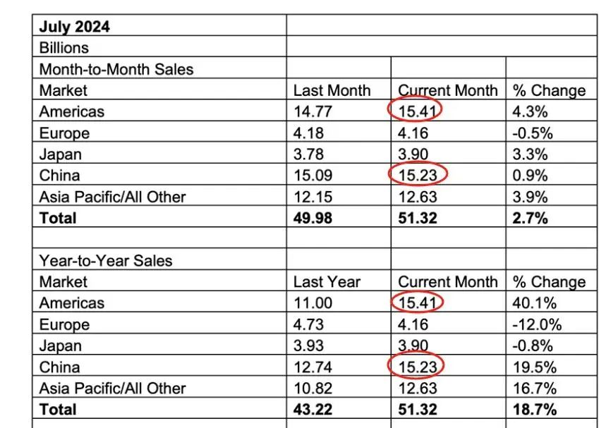 數(shù)據(jù)顯示,2024年7月全球半導(dǎo)體銷售額總計513億美元,相較于去年同期顯著增長了18.7%,其中,美國154億美元的銷售業(yè)績,以細(xì)微優(yōu)勢領(lǐng)先中國的152億美元,成為全球第一大芯片銷售市場,這是5年來的首次重大轉(zhuǎn)變。