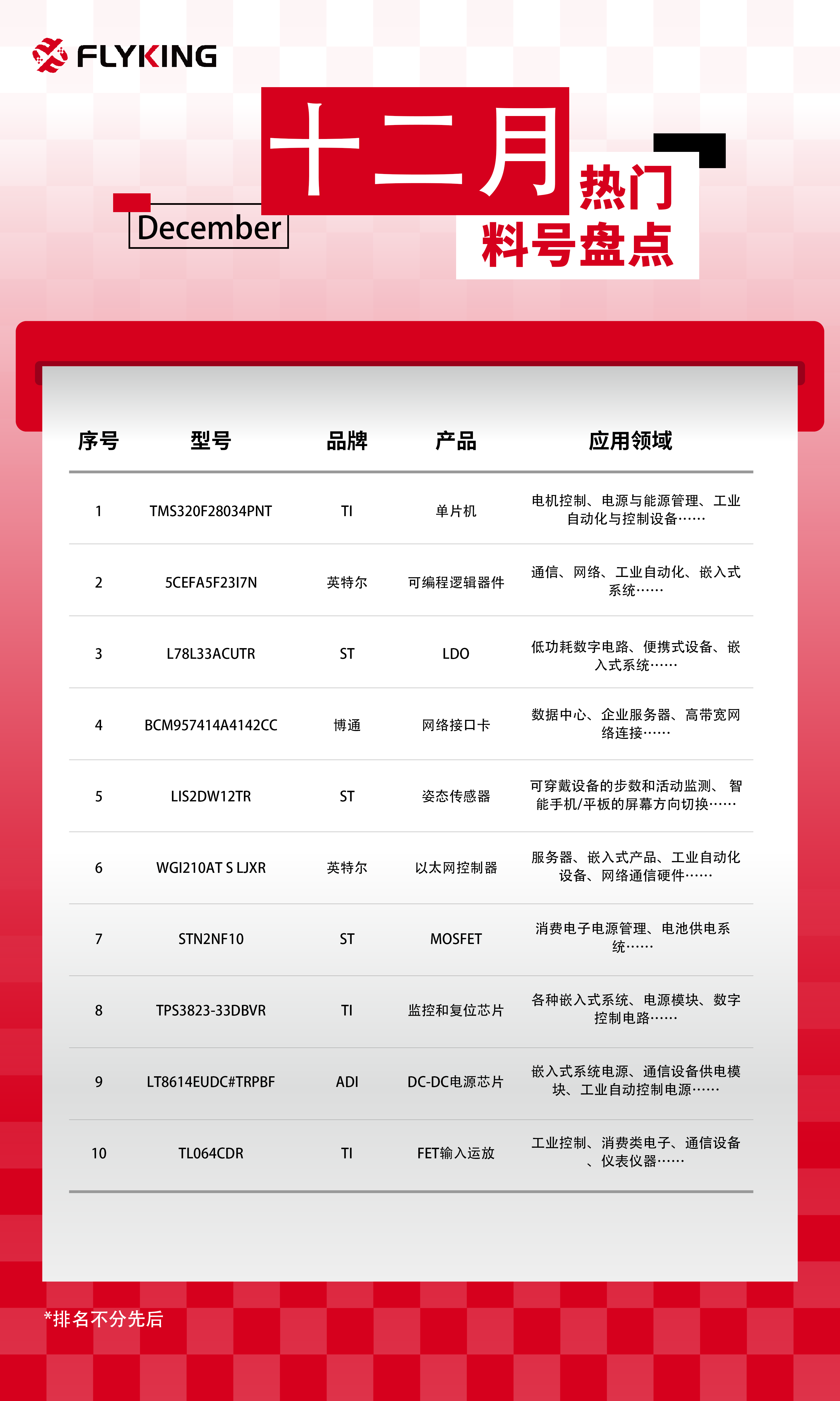 基于對市場的持續(xù)跟蹤,我們從客戶咨詢頻次、市場熱度以及行業(yè)應(yīng)用廣度出發(fā),對近期關(guān)注度較高的產(chǎn)品進(jìn)行了系統(tǒng)梳理,整理出2025年12月市場熱度較高的十大熱門料號。這些器件覆蓋工業(yè)控制、通信網(wǎng)絡(luò)、電源管理、傳感與計(jì)算等多個(gè)核心應(yīng)用方向,在一定程度上反映了當(dāng)前下游需求結(jié)構(gòu)與工程端選型趨勢。