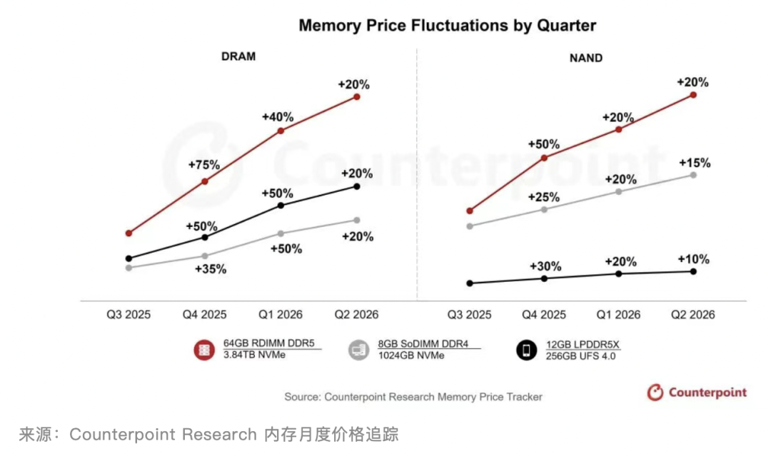 作為內(nèi)存核心組件的存儲芯片,價(jià)格同步開啟飆升模式。據(jù)市場研究機(jī)構(gòu)Counterpoint Research發(fā)布最新行業(yè)報(bào)告指出,2025年四季度內(nèi)存價(jià)格將飆升40%-50%,預(yù)計(jì)2026年一季度還將再漲40%–50%,二季度預(yù)計(jì)再上漲約20%,整體漲勢未改。