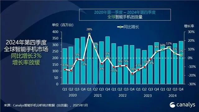 市場(chǎng)研究機(jī)構(gòu)Canalys發(fā)布的報(bào)告顯示,2024年第四季度全球智能手機(jī)市場(chǎng)同比增長(zhǎng)3%,出貨量達(dá)到3.3億臺(tái),實(shí)現(xiàn)了連續(xù)五個(gè)季度的正增長(zhǎng) 。而全年出貨量更是達(dá)到12.2億臺(tái),同比增長(zhǎng)7%,這一數(shù)據(jù)直觀地展現(xiàn)出智能手機(jī)市場(chǎng)的龐大體量與持續(xù)擴(kuò)張的態(tài)勢(shì)。