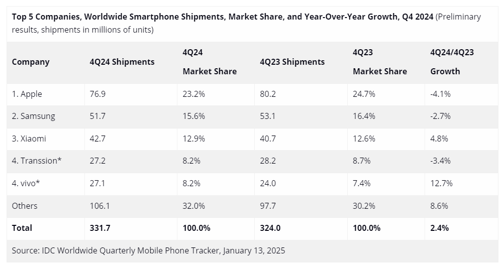 與此同時(shí),國(guó)際數(shù)據(jù)公司IDC也發(fā)布了2024年第四季度全球智能手機(jī)市場(chǎng)的出貨情況,數(shù)據(jù)顯示,該季度全球智能手機(jī)出貨量實(shí)現(xiàn)了2.4%的同比增長(zhǎng),達(dá)到3.317億部,這一增長(zhǎng)趨勢(shì)已持續(xù)六個(gè)季度。全年來(lái)看,出貨量同比增長(zhǎng)6.4%,總量達(dá)到12.4億部。IDC還預(yù)測(cè),2025年市場(chǎng)將繼續(xù)保持增長(zhǎng)態(tài)勢(shì)。